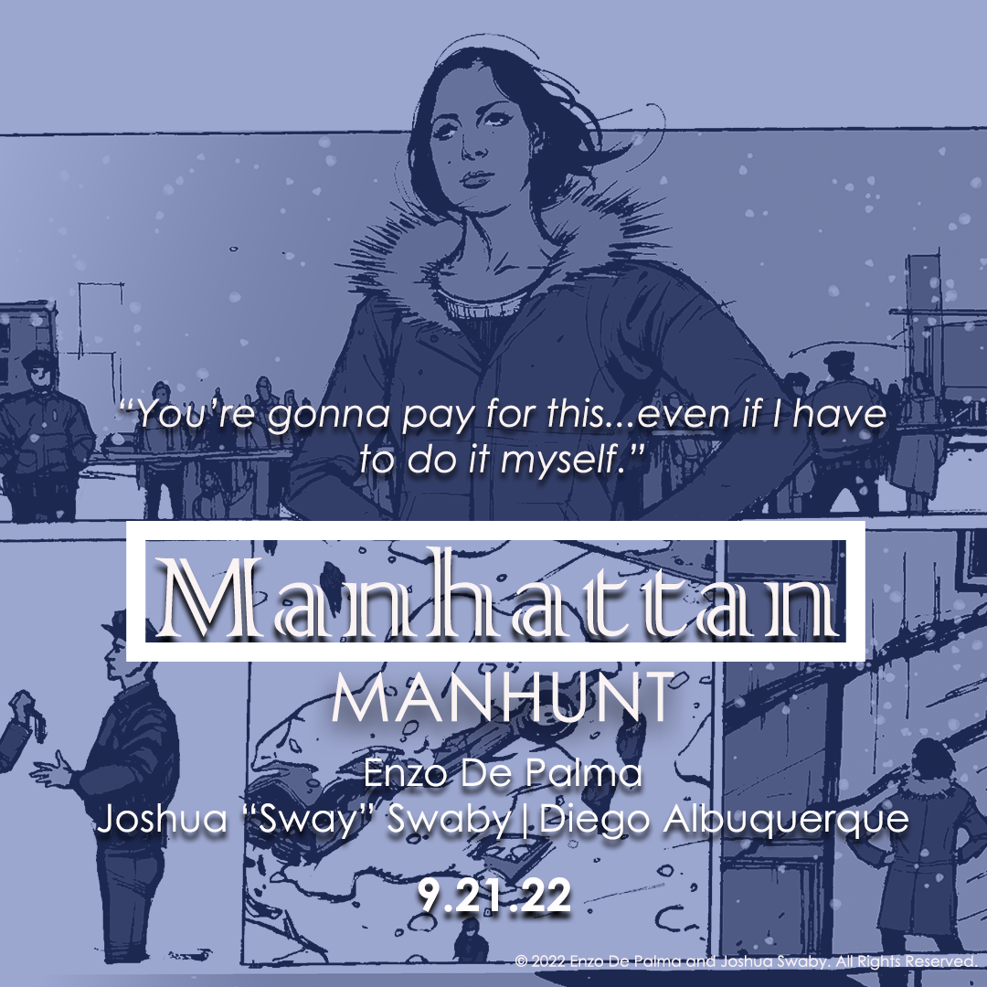 A gritty science-fiction adventure through and beneath the streets of New York, Manhattan: Manhunt is the debut graphic novel from writer Enzo De Palma and features art by rising comics star Joshua “Sway” Swaby.